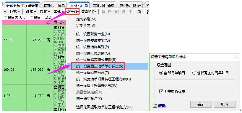 如果清單全部要固定:需按上面操作完之后,再點擊塊操作下的統(tǒng)一設(shè)置固定清單單價標(biāo)志功能。
