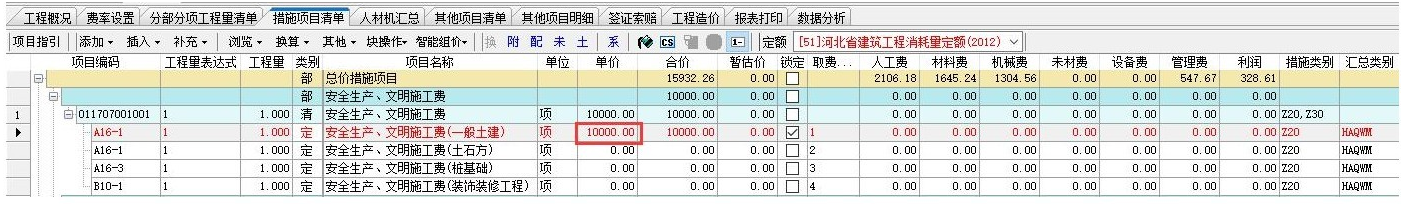 答:可以在措施項目清單界面通過鎖定功能實現(xiàn)將安全文明費設(shè)置為固定費用,即直接在定額行單價那輸入固定的數(shù)值。