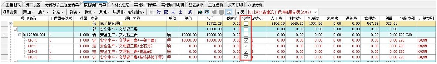 如果不希望文檔屬性或者費率重置的時候會將固定好的安全文明施工費再重置,則需要將所有的分專業(yè)的安全文明施工費的定額行都固定。如下截圖: