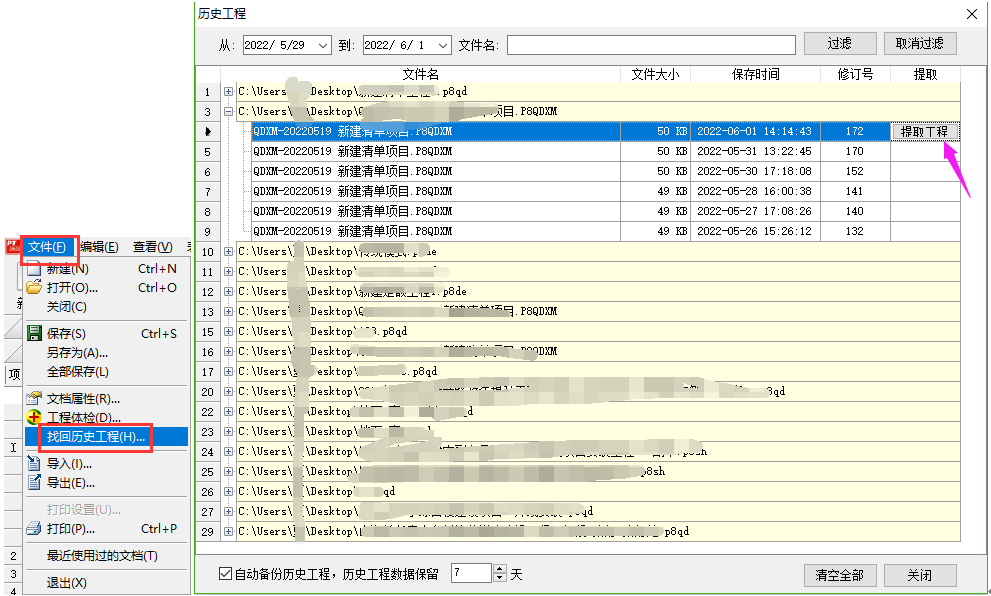 答:軟件提供找回歷史工程的功能,默認(rèn)是保留七天以內(nèi)的工程數(shù)據(jù)的。 點擊菜單欄文件下的找回歷史工程,在彈出的窗口找到對應(yīng)工程點開加號,對照保存時間列找到相應(yīng)時間點的工程,提取工程數(shù)據(jù)即可。如下所示:
