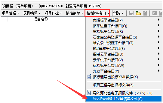 答:在建好的項目工程中,點擊招投標(biāo)接口中的“導(dǎo)入Excel版工程量清單文件”按鈕,如下圖所示: