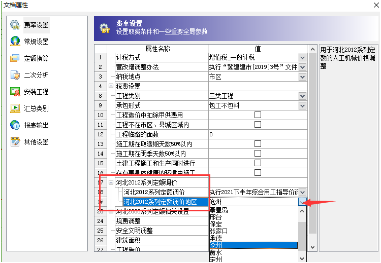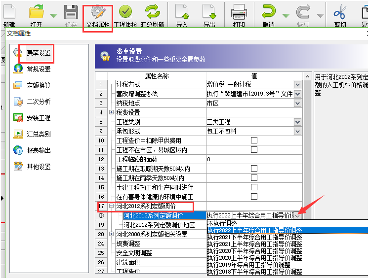 答:各地市出文件的時間不一致,大家使用的時候一定要更新到最新版本軟件程序。 更新到最新版本之后,點擊文檔屬性窗口,在默認(rèn)的第一個費率設(shè)置界面可以切換選擇對應(yīng)時間對應(yīng)地市的人工指導(dǎo)價文件。如下截圖: