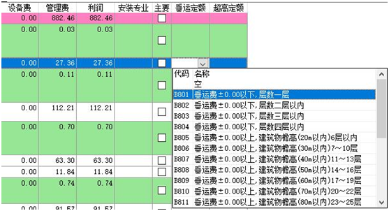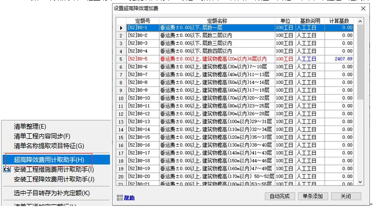 3)、執(zhí)行該命令,彈出如下窗口,應(yīng)計取的超高及垂運費用定額將變成紅色,其計取基數(shù)變成藍(lán)色。 4)、直接雙擊紅色定額行 或 點擊“單條添加”按鈕,可實現(xiàn)單條添加該項費用定額到當(dāng)前選擇的位置。點擊“自動完成”按鈕,將自動添加當(dāng)前工程所有的“垂運費”和“超高費”定額,點擊“自動完成”按鈕后,點擊自動完成,系統(tǒng)自動檢測工程中是否已經(jīng)存在相關(guān)費用定額。如已經(jīng)計取了相關(guān)費用,會進(jìn)行提示。