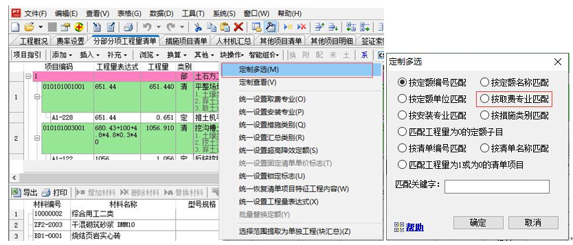 2)、選擇多條定額子目,統(tǒng)一設(shè)置“超高垂運”標(biāo)志 (1)手動按“Ctrl+左健”可選擇多條定額子目; (2)在“分部分項工程量清單”或者“預(yù)算表”界面,點擊“塊操作”下拉選擇“定制多選”,按取費專業(yè)選擇裝飾裝修專業(yè)點擊確定(這個選擇方法會一次把裝飾定額全部選擇中)。