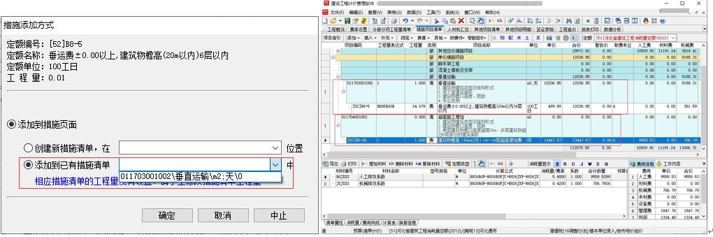 6)、點擊“確定”按鈕,由于當(dāng)前工程為清單工程,系統(tǒng)自動將費用定額添加到措施頁面中對應(yīng)措施項目下,如下圖: