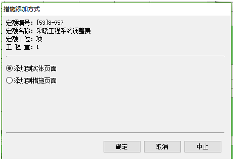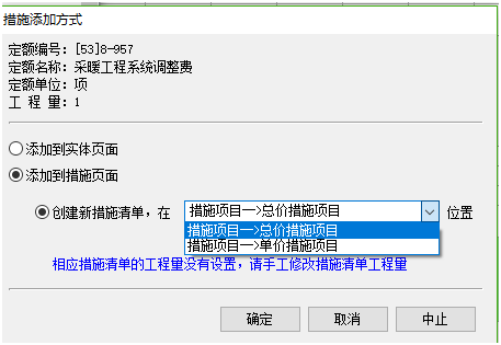 5)、執(zhí)行該命令后,出現(xiàn)措施添加方式((定額計價傳統(tǒng)模式除外))。 (1)第一種:創(chuàng)建新措施清單,可選擇添加到單價措施或總價措施。如下圖所示: (2)添加到已有措施清單,直接下拉選擇對應(yīng)清單。如下圖所示