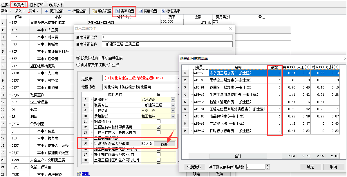 定額工程中,在取費表界面,點擊費率設(shè)置按鈕,可以通過修改組織措施費系數(shù)來實現(xiàn)。如下截圖:
