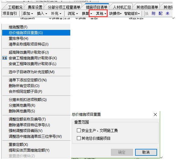 答:更新到最新版本之后,清單工程中如果安全文明或者總價措施修改了想要恢復(fù)到默認(rèn)計取的狀態(tài)。可以在措施項目清單界面,點擊其他按鈕下的總價措施項目重置。